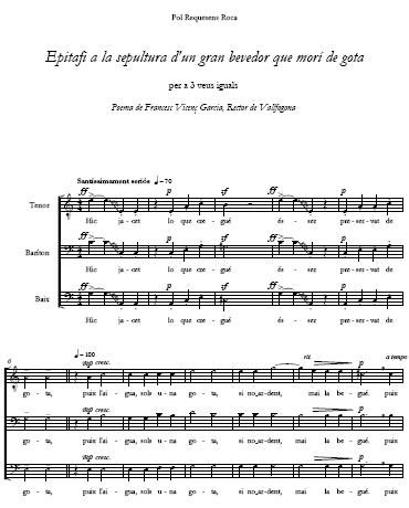 Pol Requesens, compositor de diferents gèneres, ben conegut per obres corals i per a orgue, moltes d'elles enregistrades. El 2023, vam tenir coneixement d'una composició a tres veus iguals, partitura amb indicacions per a l'adequada interpretació, Ens referim a la música aplicada al poema Epitafi a la sepultura d'un gran bevedor d'aiguardent que morí de gota. És curiós que en dos versos, cap al final de l'epitafi, amplia l'harmonització a quatre veus, potser l'autor vol destacar aquell text(?): "estarà sencer son cos, que cuc no hi ha qui don mos".