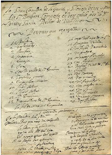 Es tracta d’un fragment inèdit de la Comèdia de Santa Bàrbara, l’obra teatral en vers que va escriure Francesc Vicent Garcia l’any 1617 en ocasió d’inaugurar-se la construcció de la capella dedicada a Santa Bàrbara, situada dins del temple parroquial de Vallfogona de Riucorb.