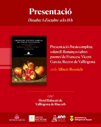 El dissabte 4 d’octubre 2025, a les 6 de la tarda, en l’Hotel Balneari de Vallfogona de Riucorb esdevingué una nova presentació de Poesia completa, volum II, romanços i altres poemes del Rector de Vallfogona, edició de l’editorial Barcino. Albert Rossich, autor de l’obra, comentà la seva llarga i àrdua dedicació a la recerca de l’obra poètica de Francesc Vicent Garcia fins aconseguir una publicació autèntica i completa.