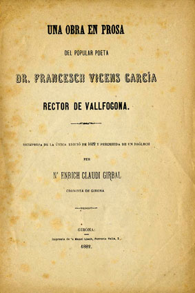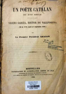 Barcelona,1876 Un poéte catalan du XVII siecle, Vicens Garcia, Rector de Vallfogona. Victor Aragon. Typographie et Lithognaphie Boehm et Fils. Imprimeurs de l'Academie des Sciences Naturalles. Montpellier,1880 |