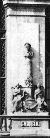 Bust atribuït a F. Vicent Garcia segons Víctor Balaguer en Las calles de Barcelona, Figura assentada sobre una columna truncada que formava part d'un conjunt de peces escultòriques amb les que s'ornamentà l'antic frontispici del Teatre Principal de Barcelona en ocasió de la reforma obrada l'any 1847 Un incendi l'any 1915 va malmetre l'edifici amb la pèrdua dels relleus escultòrics de la façana. Es pot veure la façana sencera en la secció Miscel·lània.